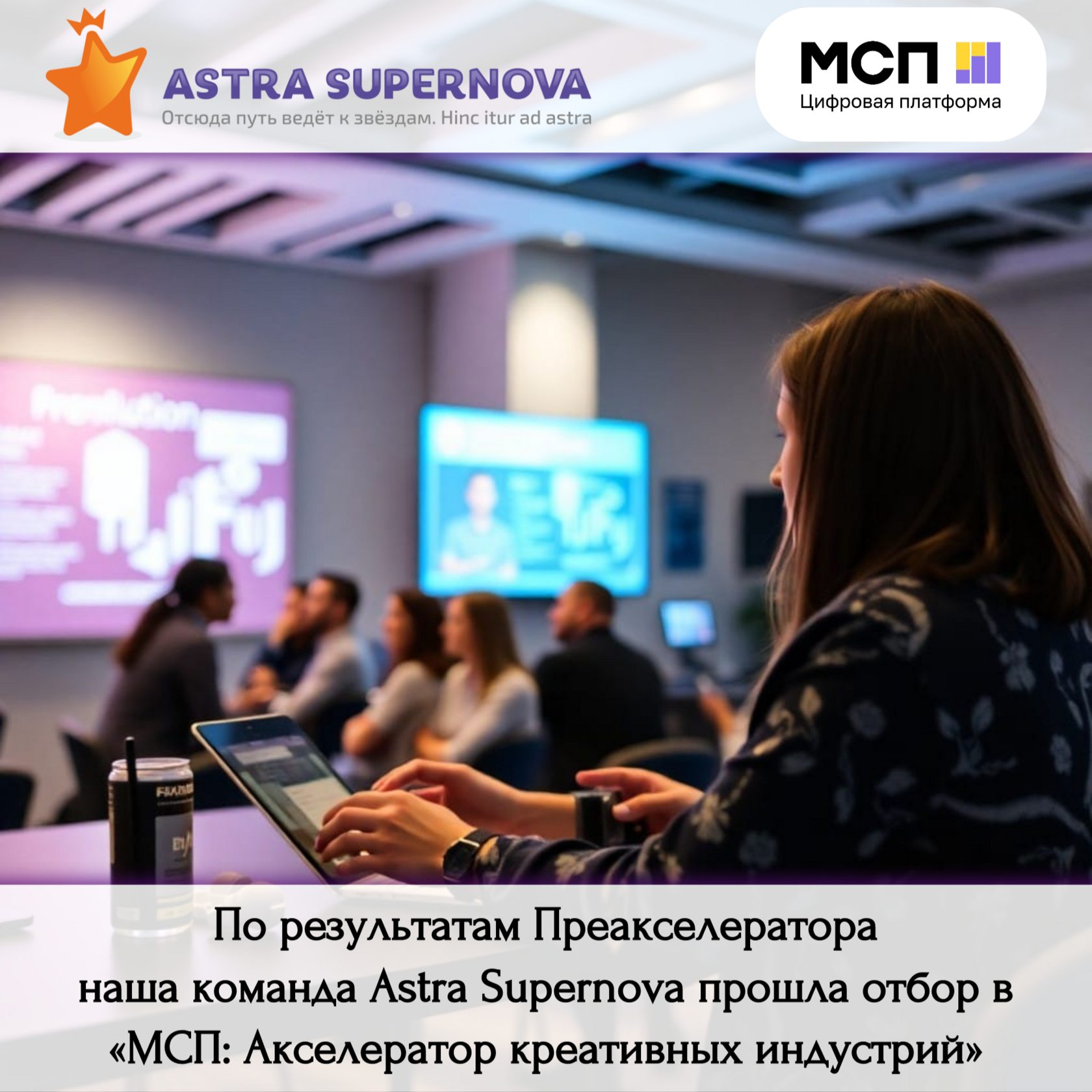 Мы с гордостью сообщаем, что наша команда Astra Supernova добилась первой значимой победы! В четверг, 23 октября 2025 года, наш проект успешно прошел строгий отбор и был включен в число 50 лучших со всей России в программу «МСП: Акселератор креативных индустрий».